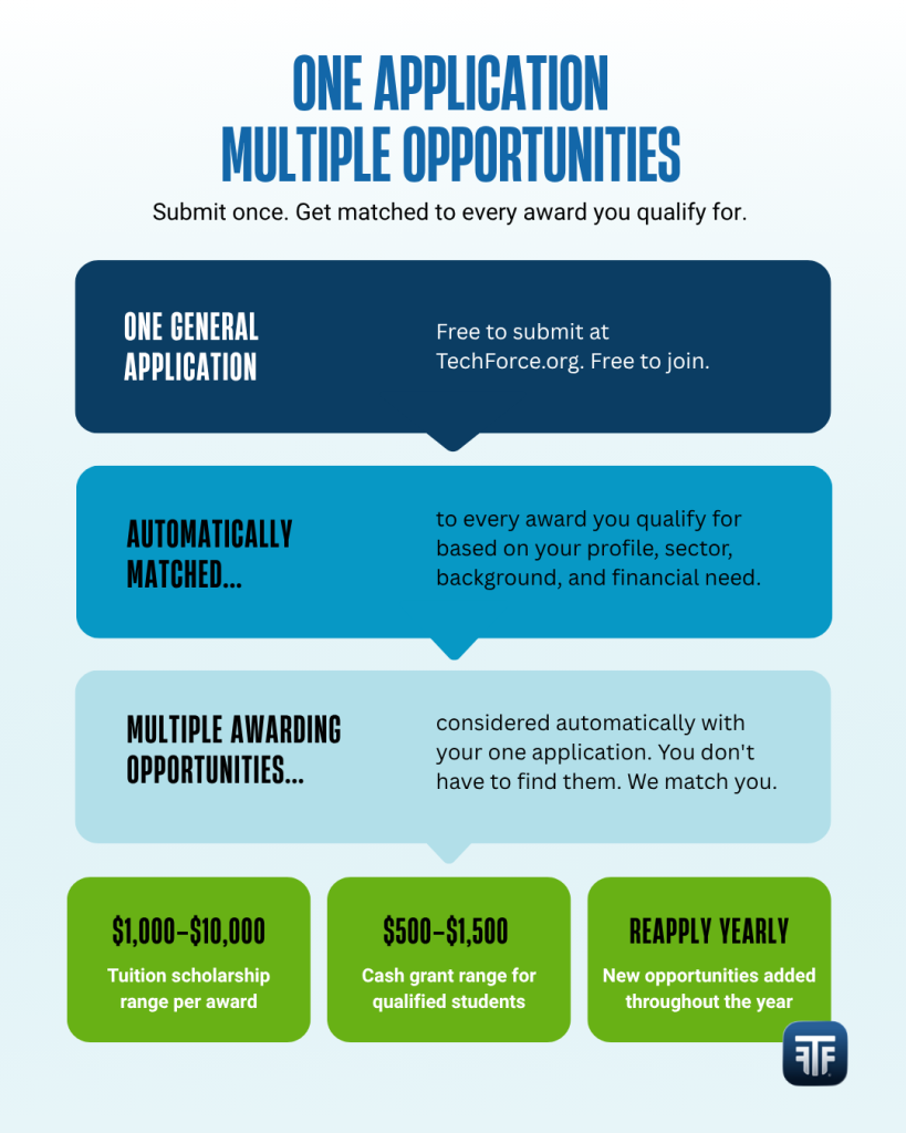 - TechForce Foundation: TechForce.org – tool contests (every two months), General Scholarship Application, industry partner discounts, and wraparound support services for students in skilled technical careers