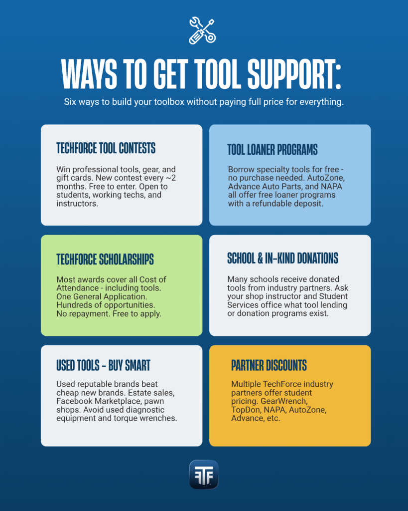 Tools are a career-long investment – but you don’t have to build your entire toolbox before your first day. Use TechForce contests for a chance to win professional gear. Use loaner programs for specialty tools. Apply for scholarships that cover Cost of Attendance, including tools. Buy used strategically. And build the rest incrementally as the work demands it.