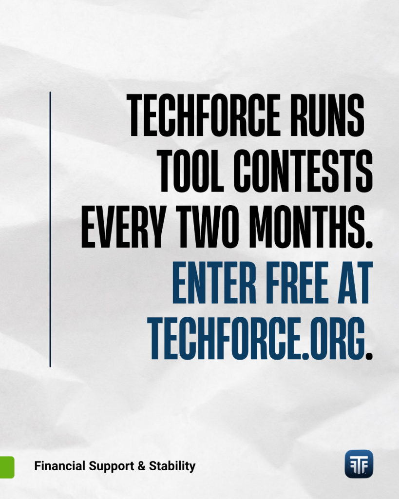 These contests are one of the most direct and accessible forms of tool support TechForce offers. Entry requirements vary by contest but are designed to be straightforward. Winners receive real, professional-grade prizes that make a genuine difference in a starter toolbox.